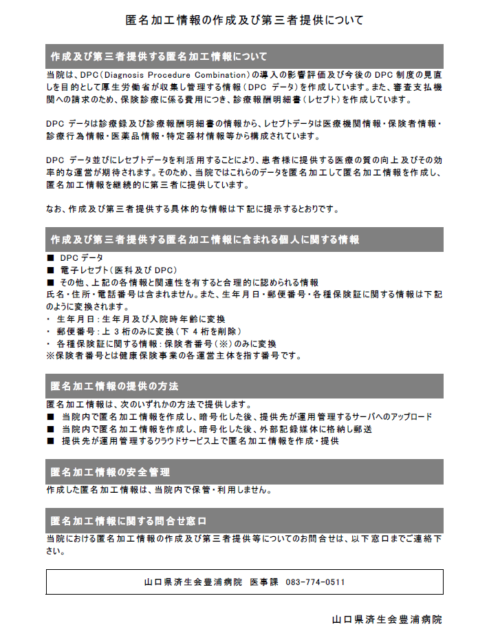 ただし、診療、医療費請求、行政機関等からの要請、医学研究等公共的要請により個人情報を第三者に提供するときは、法令上必要な措置を講じます。 また、個人情報を共同利用や、業務委託のために第三者に預託する場合は、当該第三者について調査を行い、守秘契約等によって業務委託先に個人情報保護を義務付け、その他法令上必要な措置を講じます。
